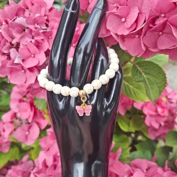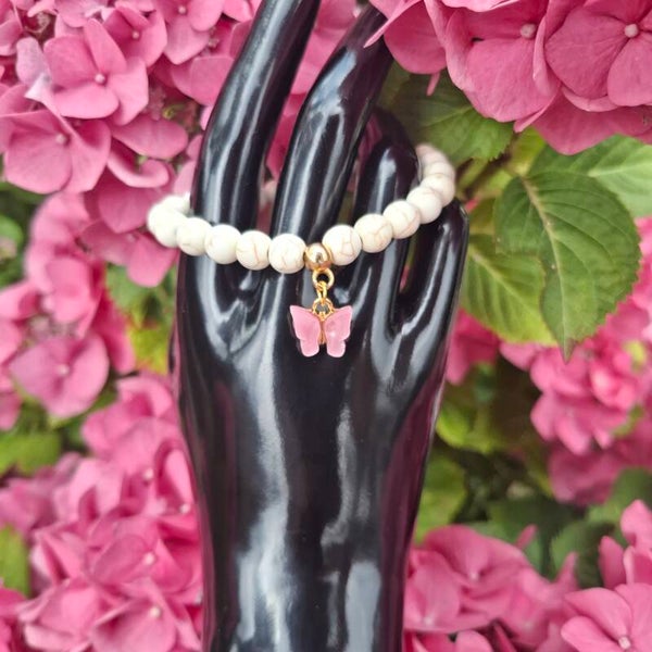 Uniek, vrouwelijk en betekenisvol drie handgemaakte damesarmbanden met een speelse mix van howliet, smaragdgroene kralen en vlinderbedels.