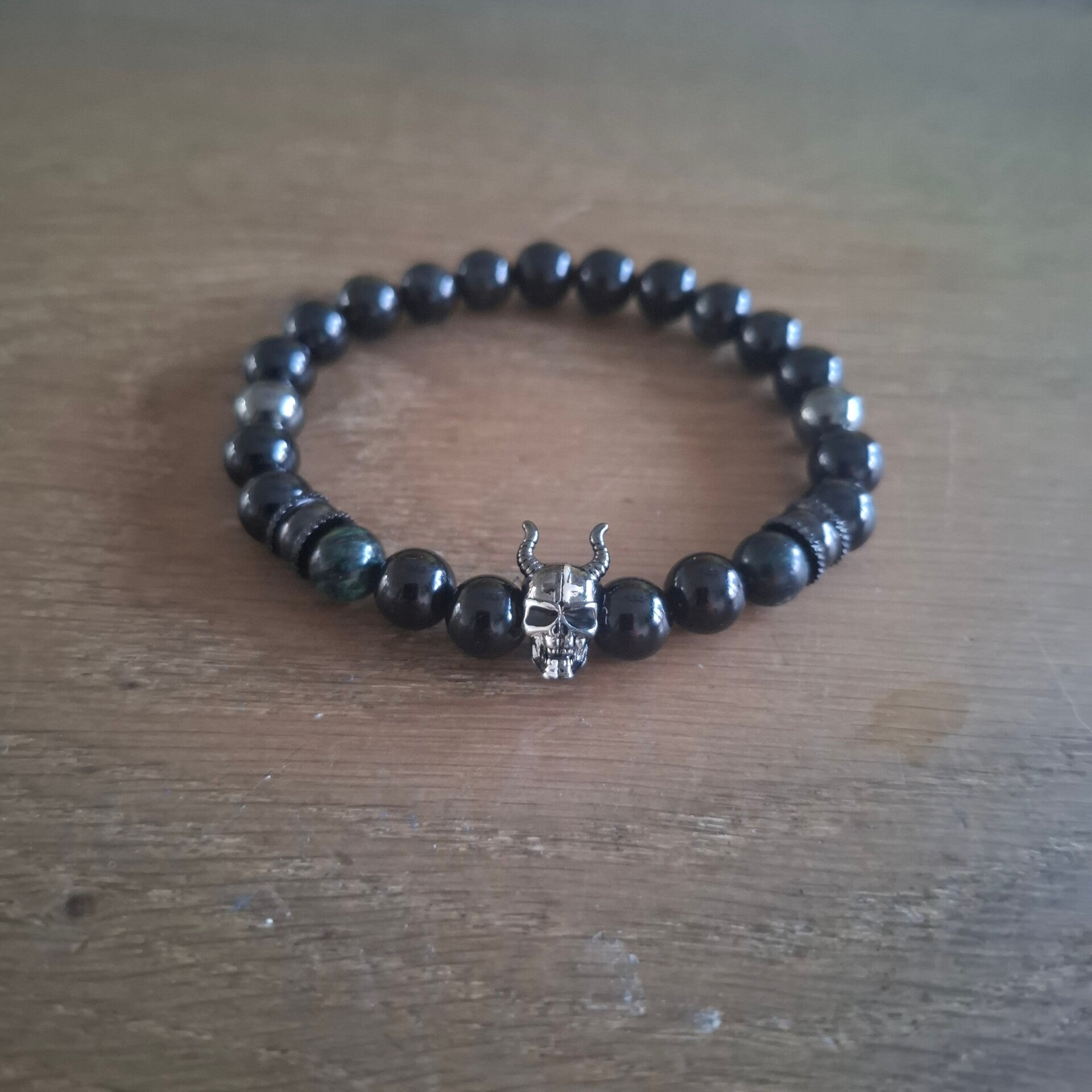 Een krachtige mix van smaragdgroen, zwarte toermalijn, hematiet, astrofylliet en obsidiaan, gecombineerd met een 925 zilveren skull-bedel.
