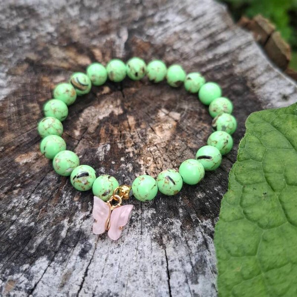 Een zachte, vrouwelijke armband met een frisse en natuurlijke uitstraling. De green howliet kralen worden gecombineerd met een schattige pastelroze vlinderbedel, wat dit sieraad een subtiele boho-touch geeft. Perfect voor elke dag of als symbolisch cadeautje.