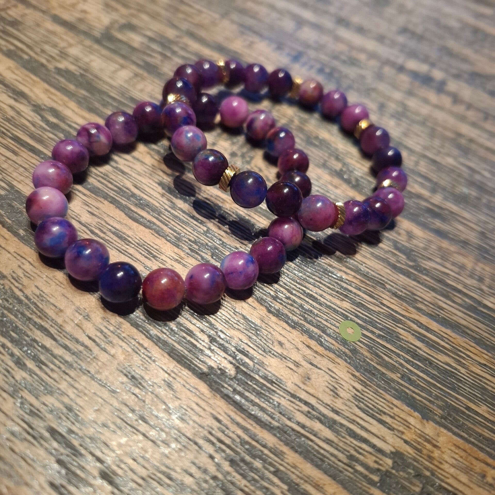 Deze handgemaakte armbandset is ontworpen voor wie houdt van zachte vrouwelijke kracht en een luxe uitstraling. De combinatie van light sugilite-paarse kralen met goudkleurige tussenstukken geeft deze set een elegante, warme en moderne look.