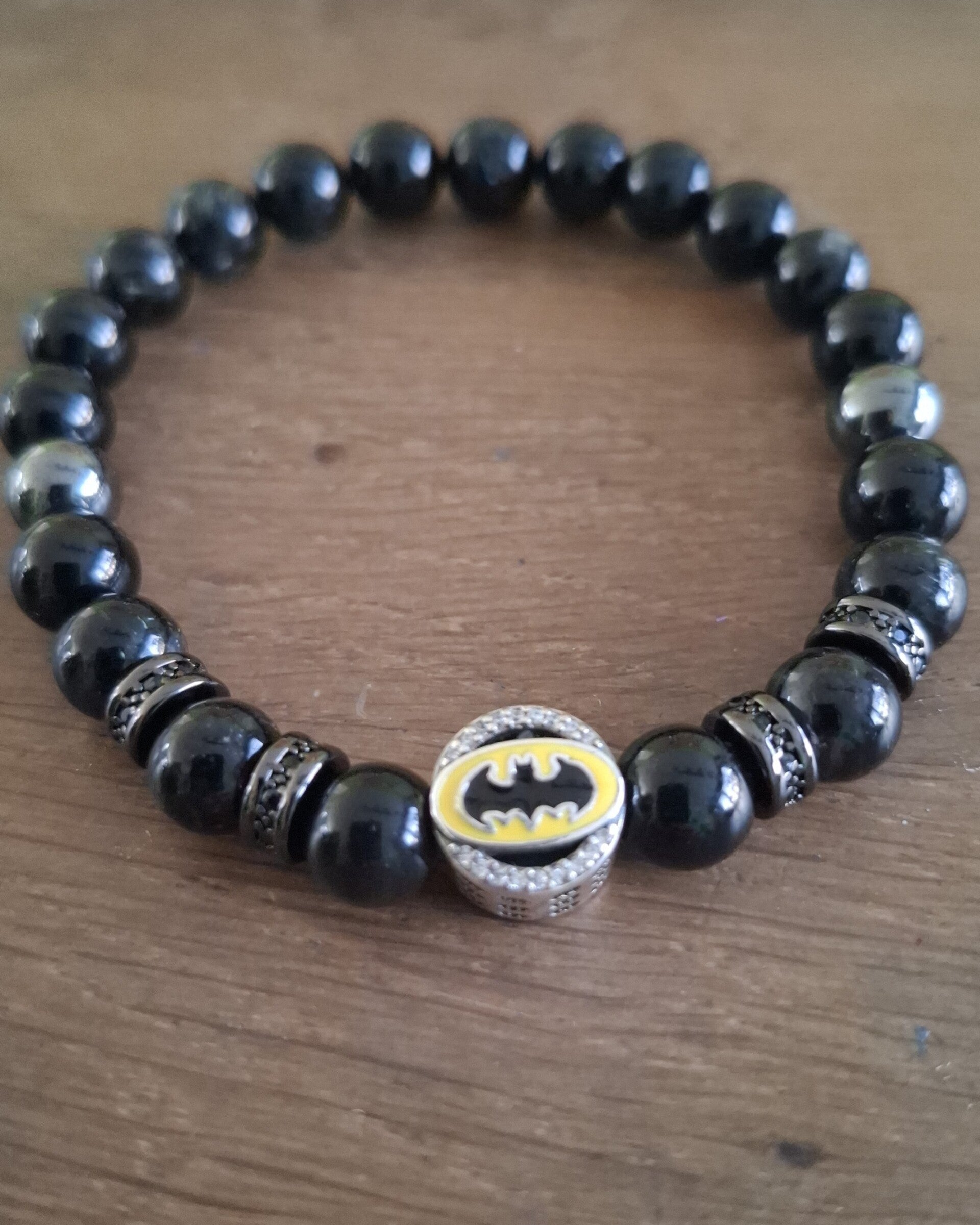 Deze armband combineert lava, zwarte toermalijn, hematiet en astrofylliet met luxe micro pavé spacers en een opvallende S925 Dark Bat bedel.