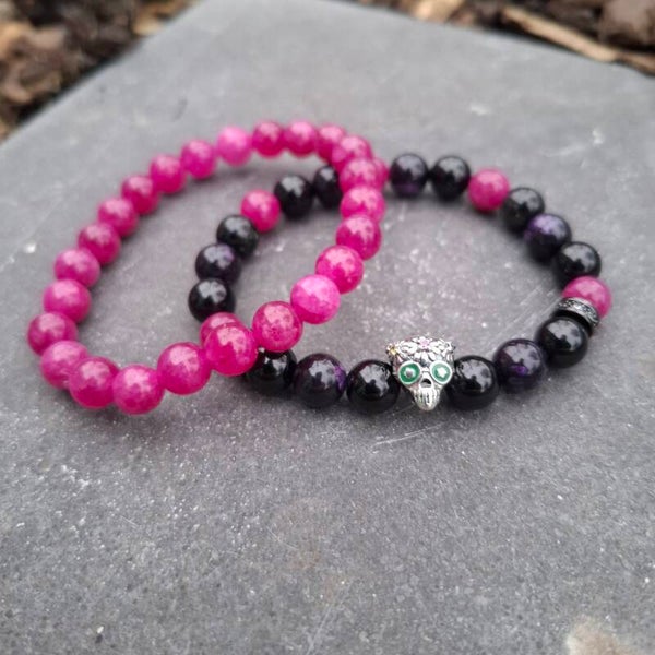Handgemaakt door Bohobeadedjewelry combineert deze armband diepe zwarte edelstenen met intens roze toermalijn en een unieke skull bedel met bloemenkrans. Een krachtige balans tussen rebel energy en feminine fire.